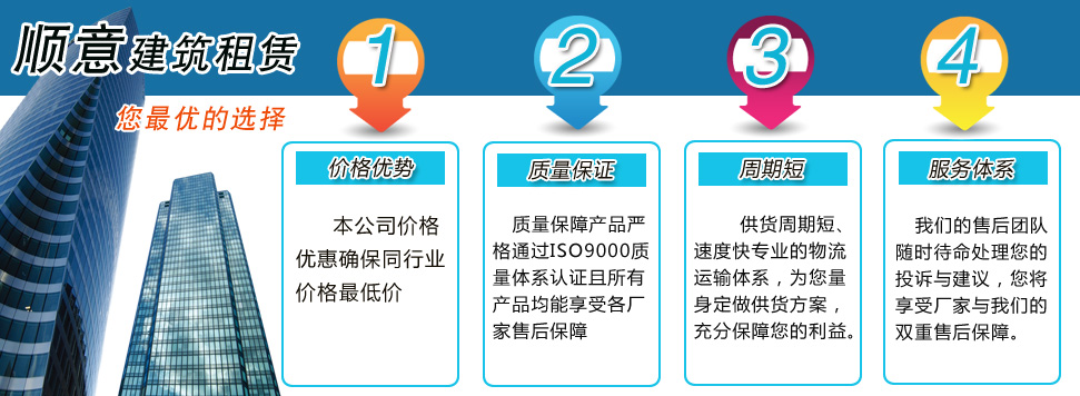 蘭州順意租賃有限公司,主要再甘肅、蘭州等地從事建筑業(yè)用的鋼管、碗口、扣件、頂托等。本公司長(zhǎng)期承包各類(lèi)工程的搭拆運(yùn)一條龍服務(wù),在甘肅、蘭州具有完善的服務(wù)體系,雄厚的實(shí)力,業(yè)務(wù)遍及甘、青、寧、西部多省,可以滿(mǎn)足各地區(qū)建筑商及租賃界朋友的需求,規(guī)格齊全、貨物充足。并大量批發(fā)銷(xiāo)售竹(木)模板、木方及竹架板等業(yè)務(wù)。希望能同您一起,攜手創(chuàng)建新的未來(lái)。真誠(chéng)期待您的來(lái)電。聯(lián)系熱線(xiàn):1500262887213993...... {查看詳情}